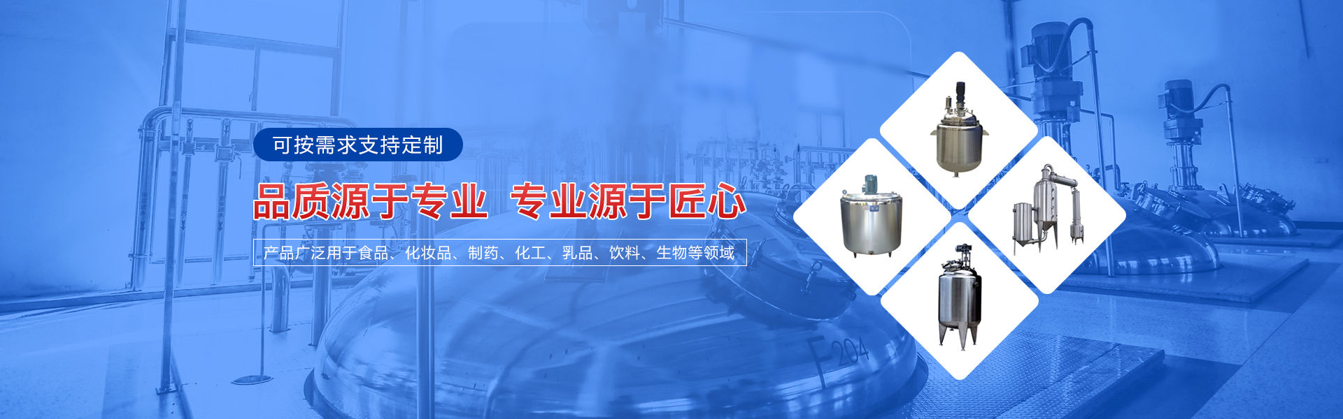 主要經(jīng)營各種機(jī)械設(shè)備的制造、加工、銷售,主要產(chǎn)品有攪拌罐、冷熱缸、發(fā)酵缸、乳化罐、貯罐、移動罐、夾層鍋、調(diào)配罐、脫氣罐、方槽、電加熱調(diào)配罐等各種食品機(jī)械和制藥機(jī)械。產(chǎn)品廣泛被用于食品、化妝品、制藥、化工、乳品、飲料、生物等領(lǐng)域,深受新老客戶的信賴與好評。